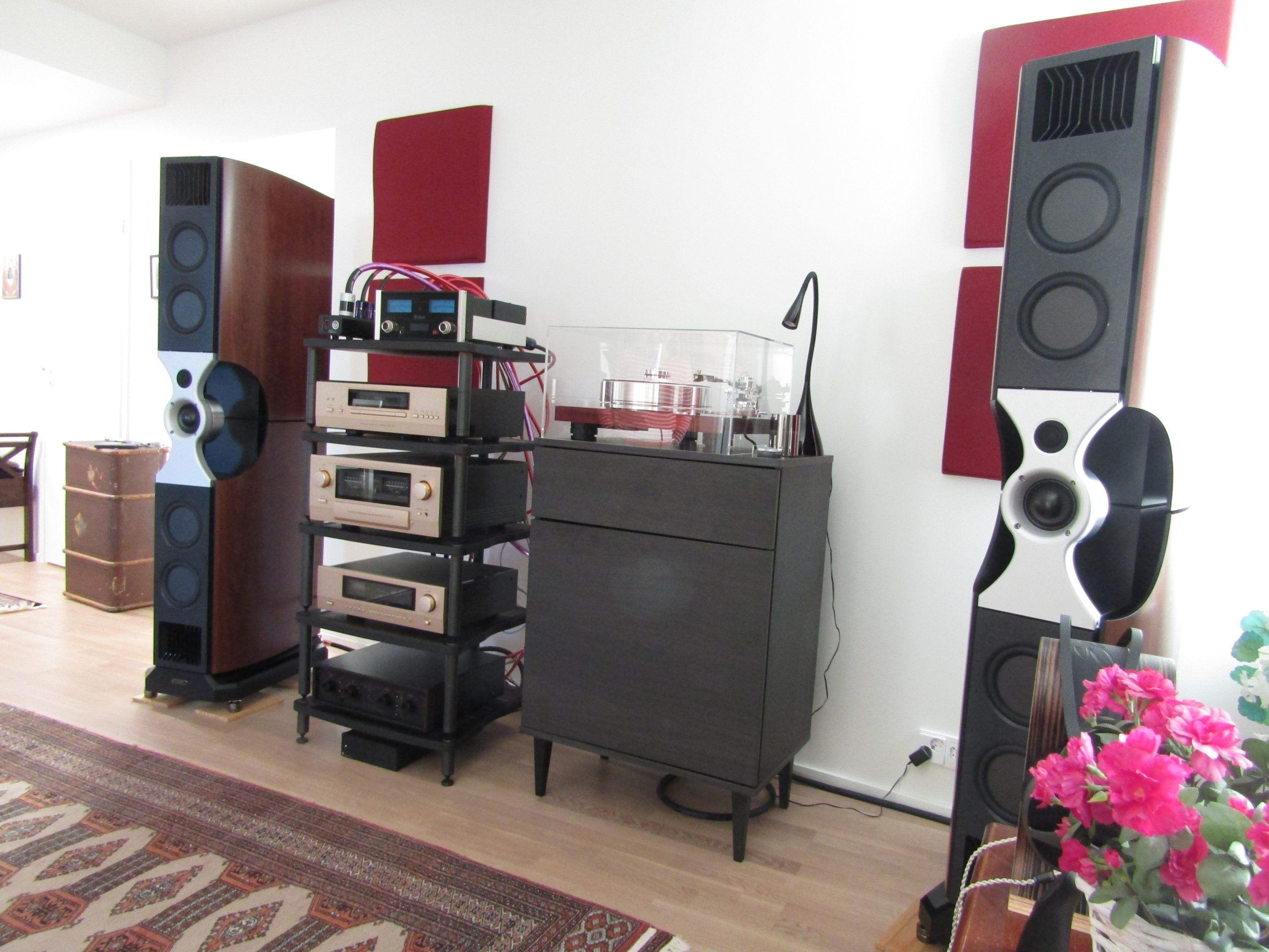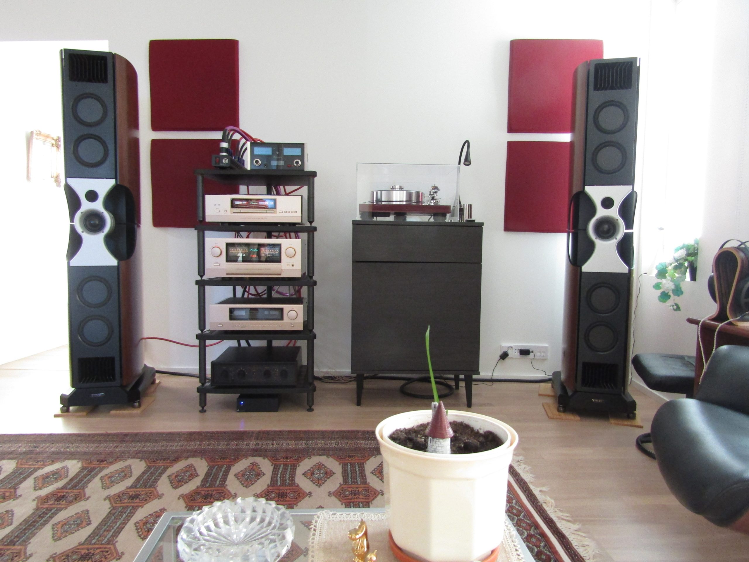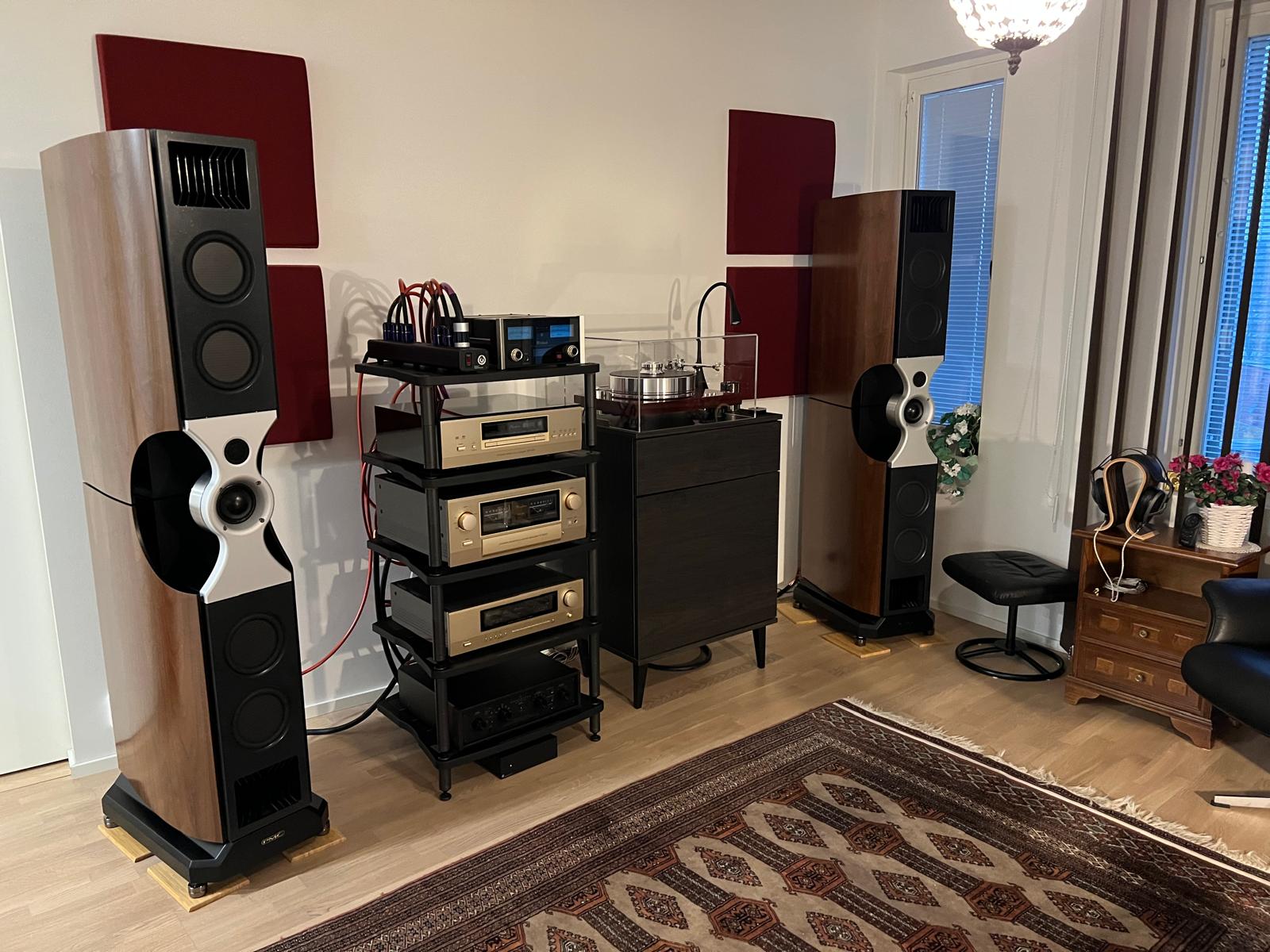 – Olen elämäni varrella asunut monissa paikoissa, mutta aina joutuessani muuttamaan, ensisijaisena kriteerinä on ollut löytää tila, johon akustiikka huomioiden pystyy luomaan hyvin toimivan stereojärjestelmän. Tämä nykyinen tila on hieman kiilamainen, epäsymmetrinen, ja toinen kaiuttimista on aika lähellä ikkunaseinää, jota olen yrittänyt vähän käsitellä, samoin etu– ja takaseinää muutamalla akustiikkalevyllä. Matkaa kaiuttimien etulevystä takana olevaan seinään on noin metri. MR Hifin pojat kävivät kokoamassa Fenestriat ja fiksasivat paikan. Olen erittäin tyytyväinen lopputulokseen.