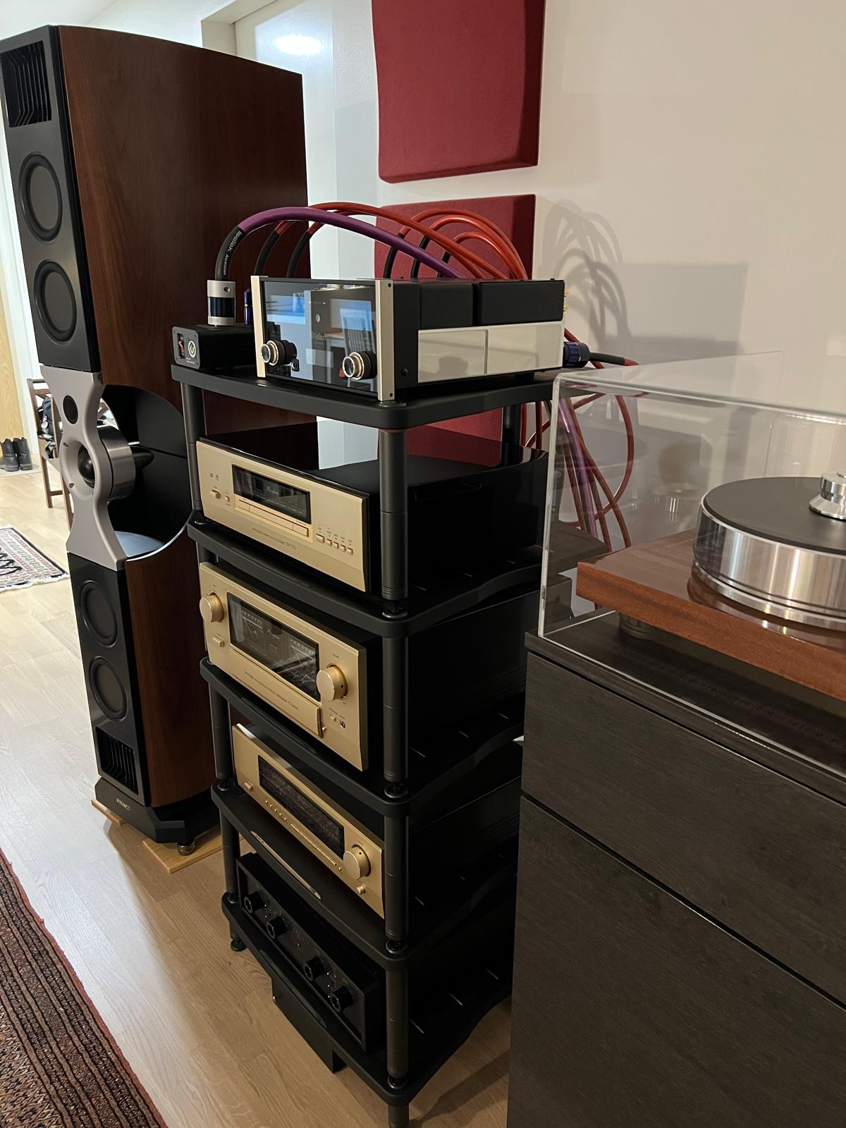– Technicsin levarin korvasin jokin aika sitten Pro-Jectin malliston kärkipään soittimella, Signature 10:llä, johon hankin Soundsmith Susurro Mk2 Gold mi-äänirasian. Phono-esivahvistimena on Moonriverin hybridi 505. Kuulokevahvistin on McIntoshin MHA100 ja kuulokkeet Mezen Elitet. Virtakaapelit ja jakoblokki tulevat IsoTekilta, välikaapelit Chordilta ja kaiutinkaapelit Cardasilta. Eikä unohtaa sovi laiteräkkiäkään, Mr Hifiltä hankkimaani, italialaista käsityötä ja designea ajattomasti edustavaa Bassocontinuo Classic Line -laitetelinettä. Siihen Accuphaset istuvat tavalla, joka muodostaa harmonisen kauniin kokonaisuuden.